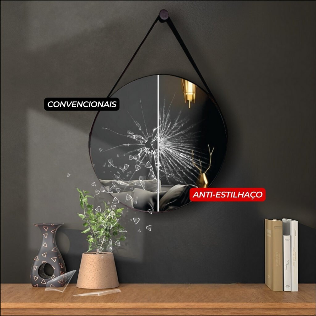 Um espelho convencional quebra em pedaços afiados quando danificado, representando um risco de ferimentos. Já um espelho anti-estilhaços é projetado para minimizar esse risco, mantendo os fragmentos de vidro unidos em caso de quebra. Isso faz com que sejam mais adequados para ambientes onde a segurança é uma preocupação, como banheiros públicos, academias, escolas e etc…